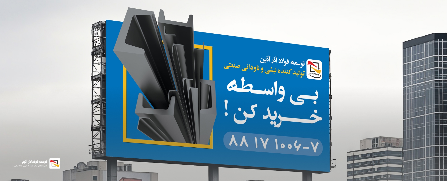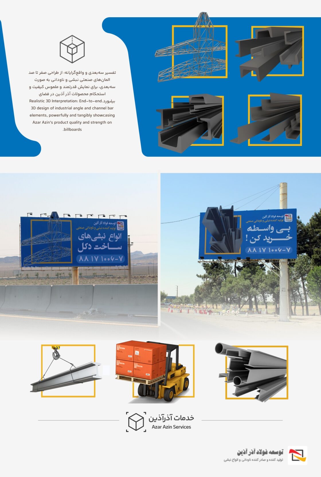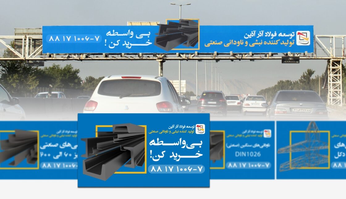 Proudly presenting the “Azar Azin Steel Development” billboard design project; where the strength of angle and channel bars comes to life through our 3D design artistry. From the meticulous creation of visual elements in a three-dimensional space to their skillful implementation on urban billboards, every component has been crafted to showcase the power and quality of this major industrial brand. Billboards that not only inform but also leave a lasting impression on the audience’s mind.