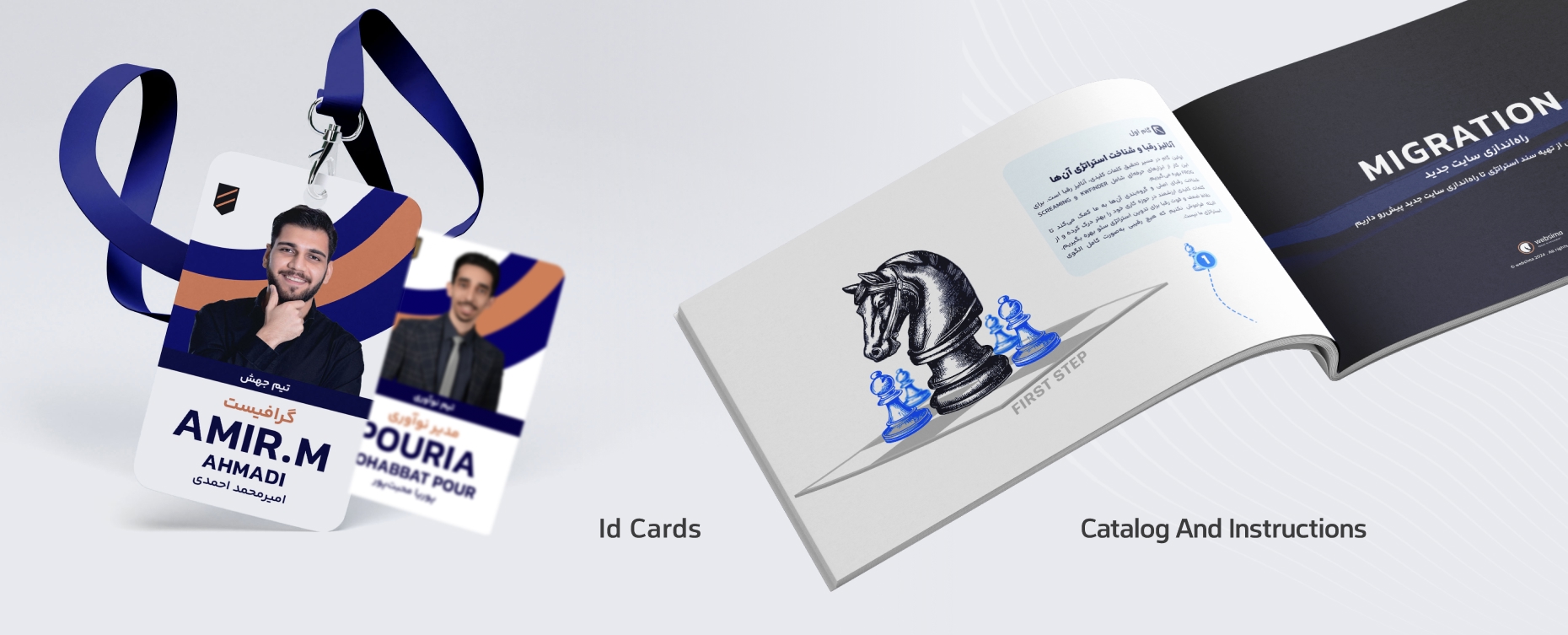Proudly presenting the comprehensive design project for “Websima Assets”; a complete suite of visual tools where the spirit of innovation and Websima’s commitment shine through in every detail. From the elegance in designing business cards and ID cards, each a symbol of professionalism, to the dynamic pages of catalogs and organizational guidelines that chart the path to growth, and finally, appreciation plaques that immortalize achievements. Every item has been meticulously crafted to not only represent the brand but also serve as a powerful tool for communication and impact.