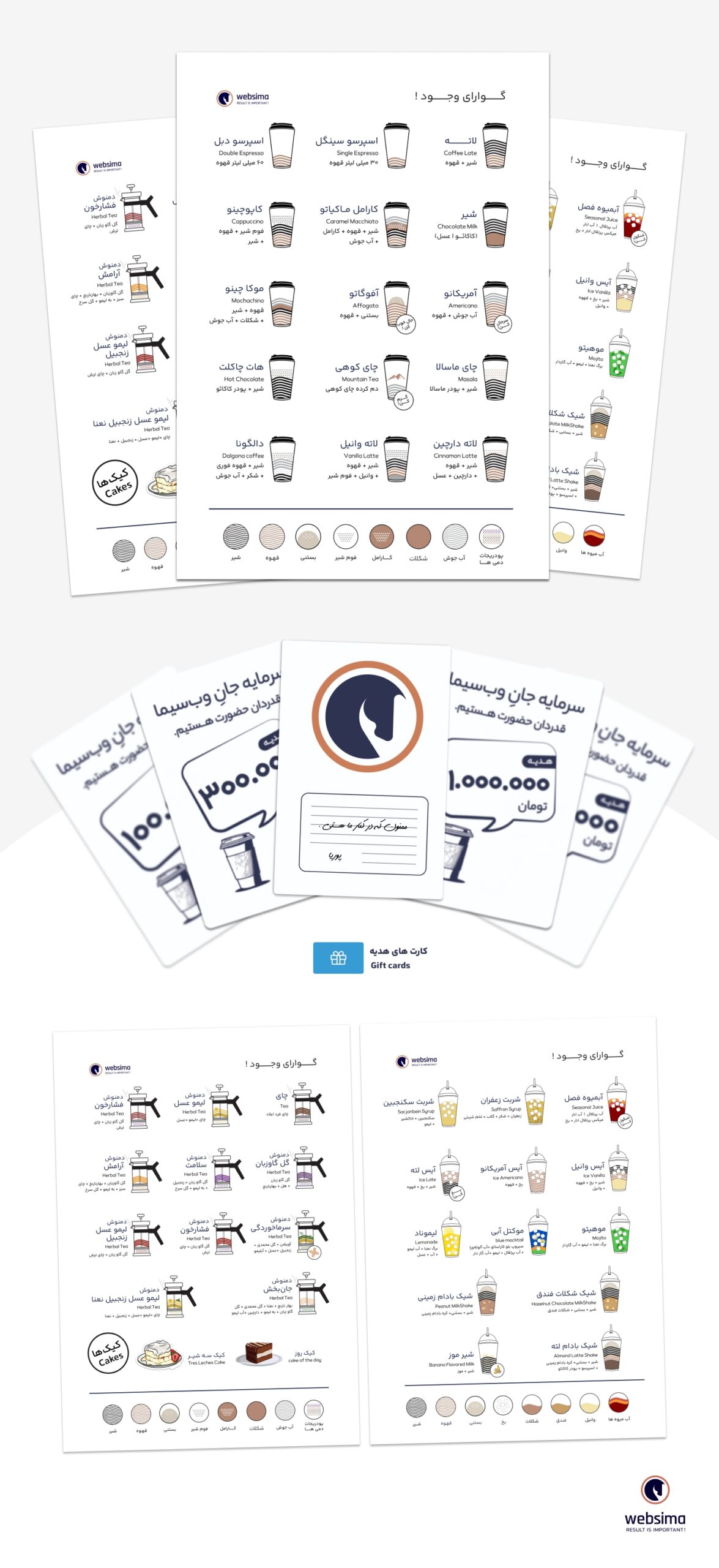 Presenting the “Websima” cafe menu; where every drink is not just a flavor, but a work of art. With precision and elegance, we’ve hand-illustrated every item as a vector, ensuring each cup harmonizes with the cafe’s unique serving ware, creating an unparalleled visual experience. Additionally, the cafe’s minimalist gift cards, inspired by Websima’s corporate identity, bestow a sense of exclusivity upon customers
